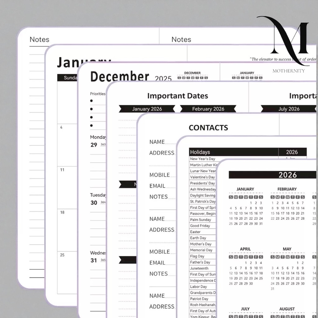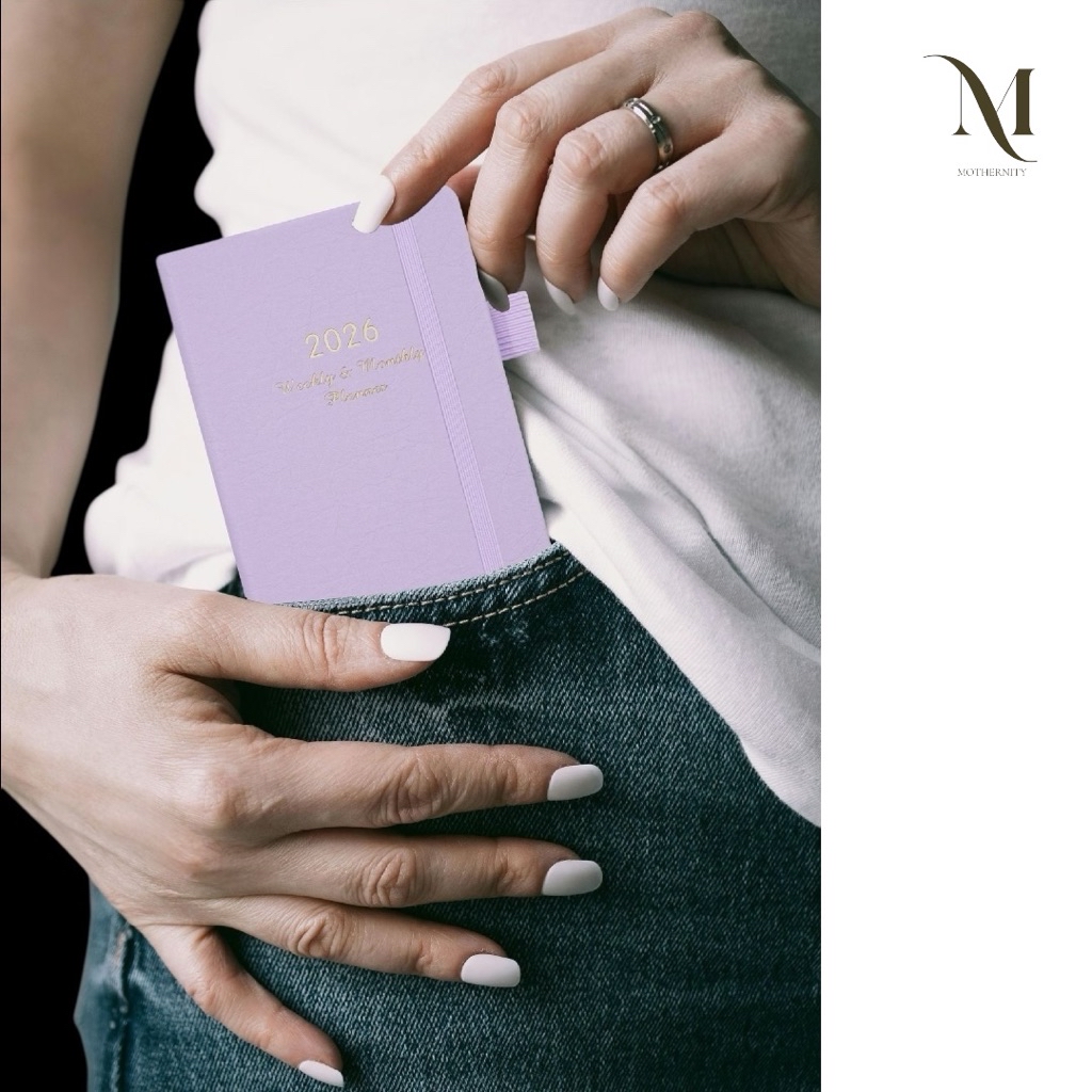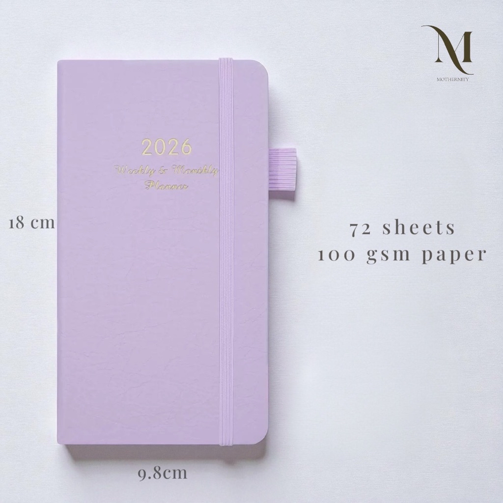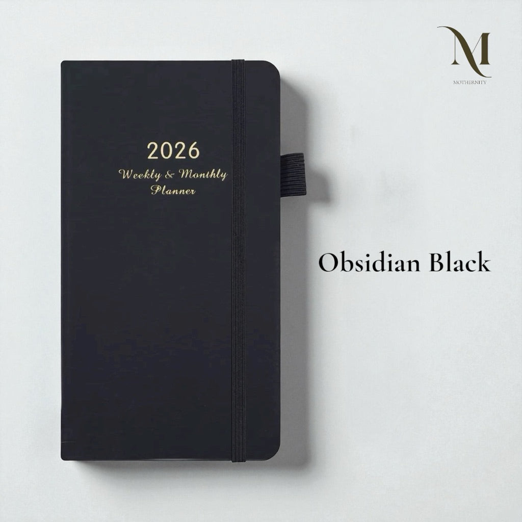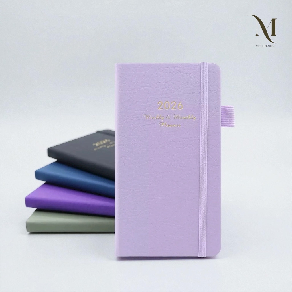 Elegant 2026 English planner featuring both monthly and weekly layouts for effortless organisation. Available in five refined shades: Obsidian Black, Navy Blue, Pale Lilac, Dark Olive Green, and Violet. Compact A6 slim size (9.8 × 18 cm) — lightweight and portable for work, study, or travel. Premium 100 gsm paper, 72 sheets (144 pages) for smooth, bleed-resistant writing. Sturdy hardcover with elastic band and pen loop for a neat, professional finish. Thoughtfully structured pages for goals, notes, and schedules. A timeless desk companion or thoughtful gift for planners, students, and professionals.