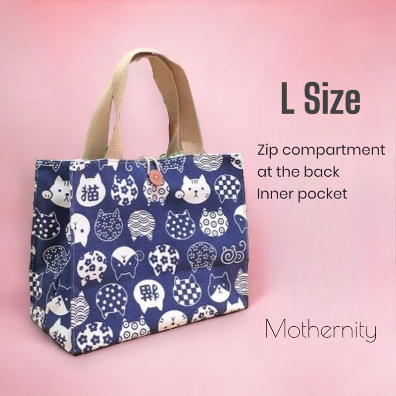 Canvas Tote Bag Lunch Bag with Zip Pocket | Japanese Style Cat Print | Mummy Casual Bag